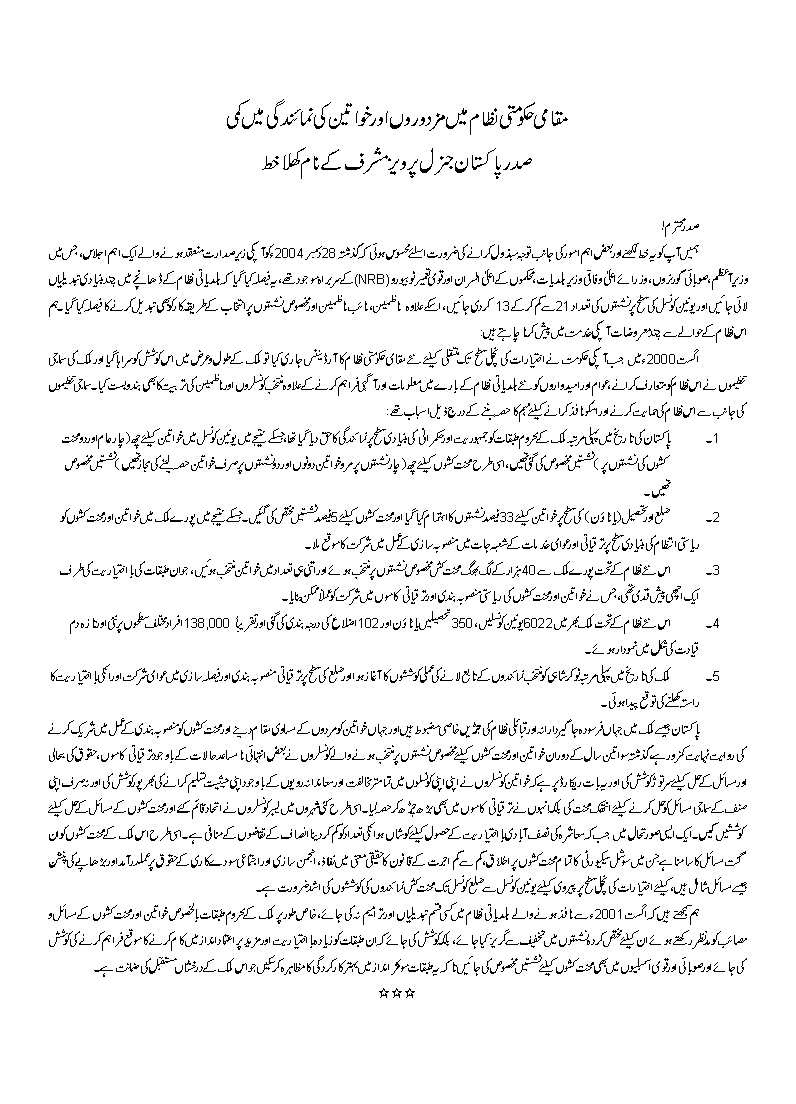 We want to invite your attention to the decision taken by your government on 28 December 2004 to make some vital changes in the structure of the local government system. According to the new plan the strength at union council has been reduced from 21 to 13, which will ultimately affect the representation of women and the labour in the local governments.